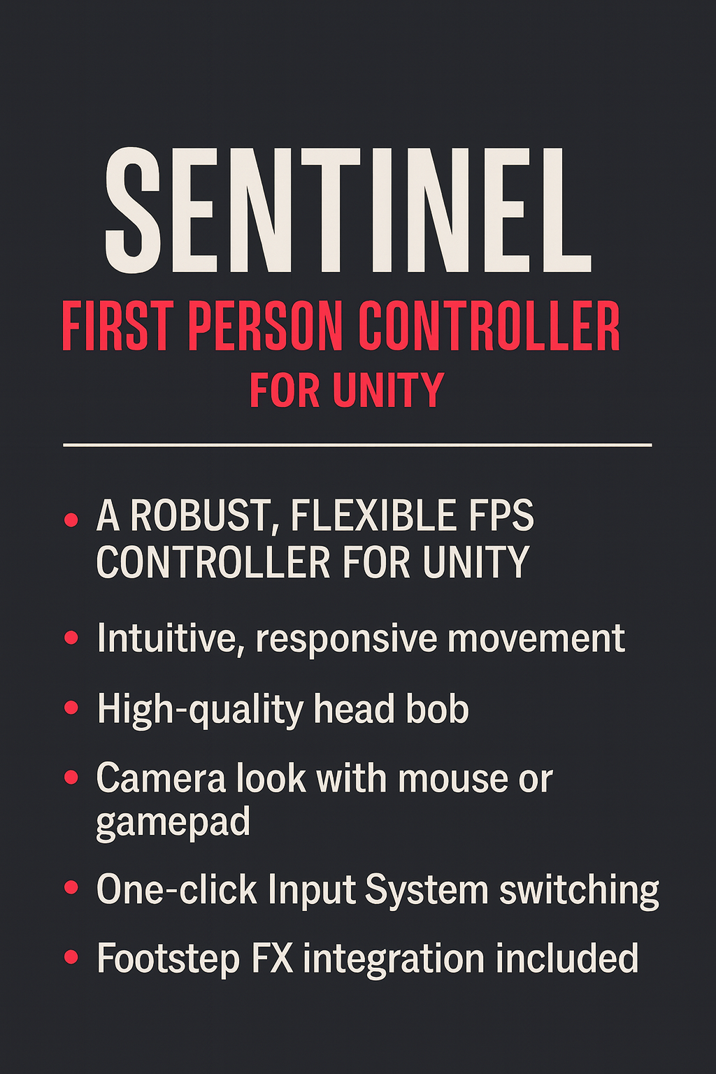 Sentinel First Person Controller is a clean, reliable, and highly configurable first-person controller designed for Unity developers who want something that just works. No fluff, no complications — drop it into your project and go.