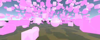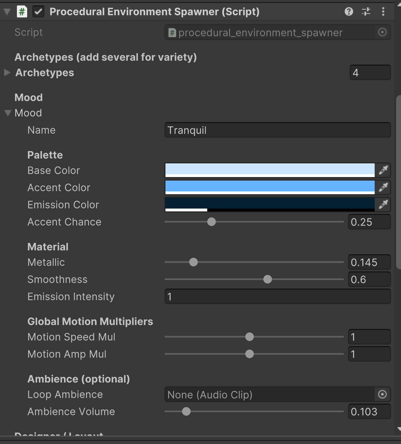Pick a mood, hit Generate, and it spawns a whole field of objects with colors, motion, fog and ambience already dialed in.